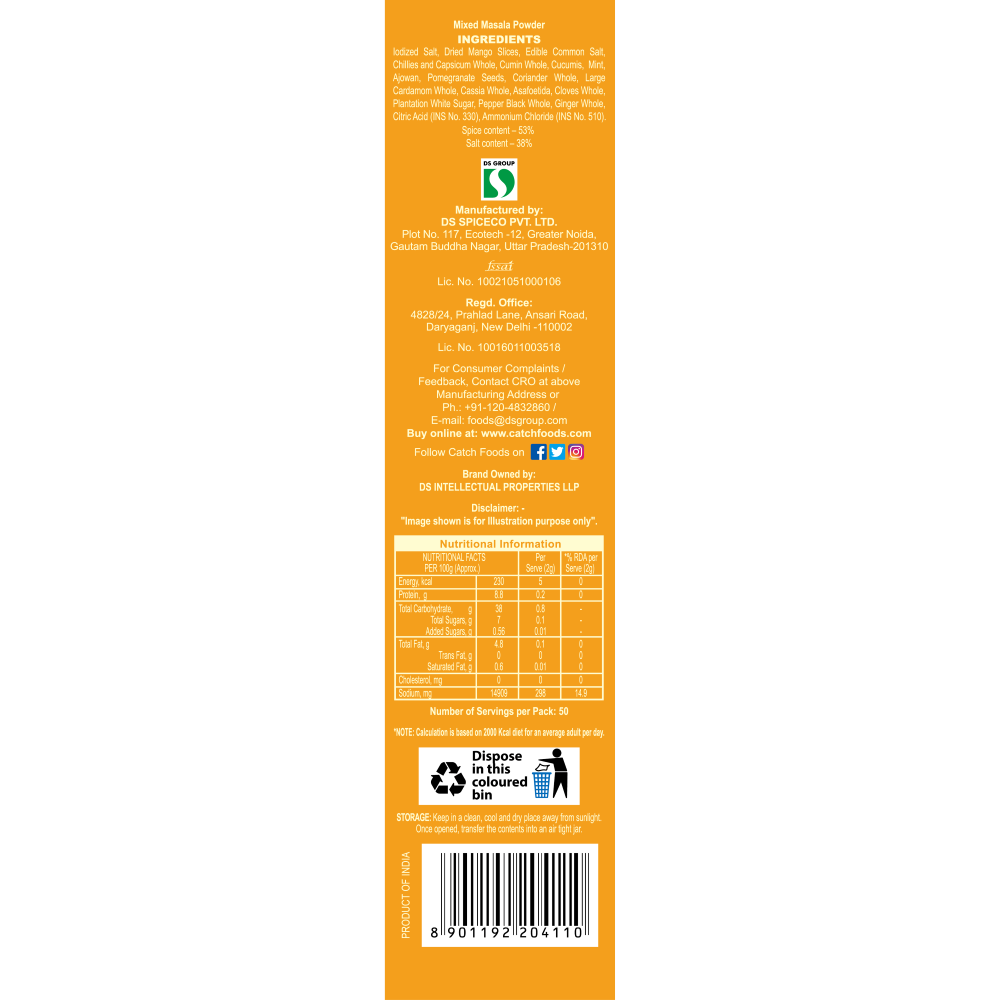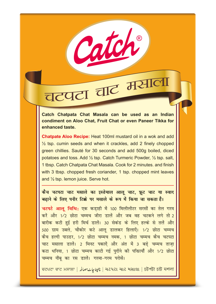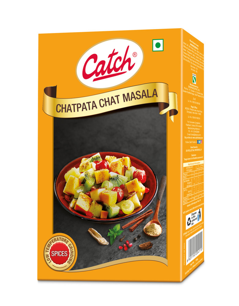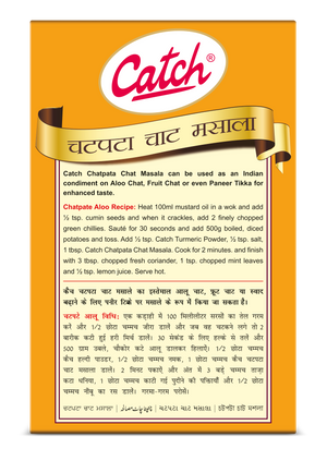 Catch Chatpata Chat Masala is a combination of many simple spices that are blended to an all-in-one seasoning for fruits and vegetables. Chatpata Chat Masala is tangy in taste and elevates the richness of fruits and vegetables and can also be used in gravies and curries to add tanginess. The Chatpata Chat Masala also aids in digestion. This is a Jain product.