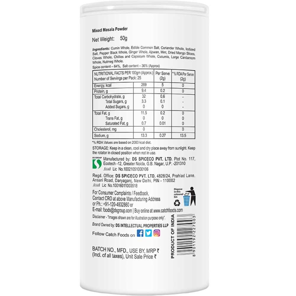 Cumin Whole, Edible Common Salt, Coriander Whole, lodized Salt, Pepper Black Whole, Ginger Whole, Ajowan, Mint, Dried Mango Slices, Cloves Whole, Chillies and Capsicum Whole, Cucumis, Large Cardamom Whole, Nutmeg Whole