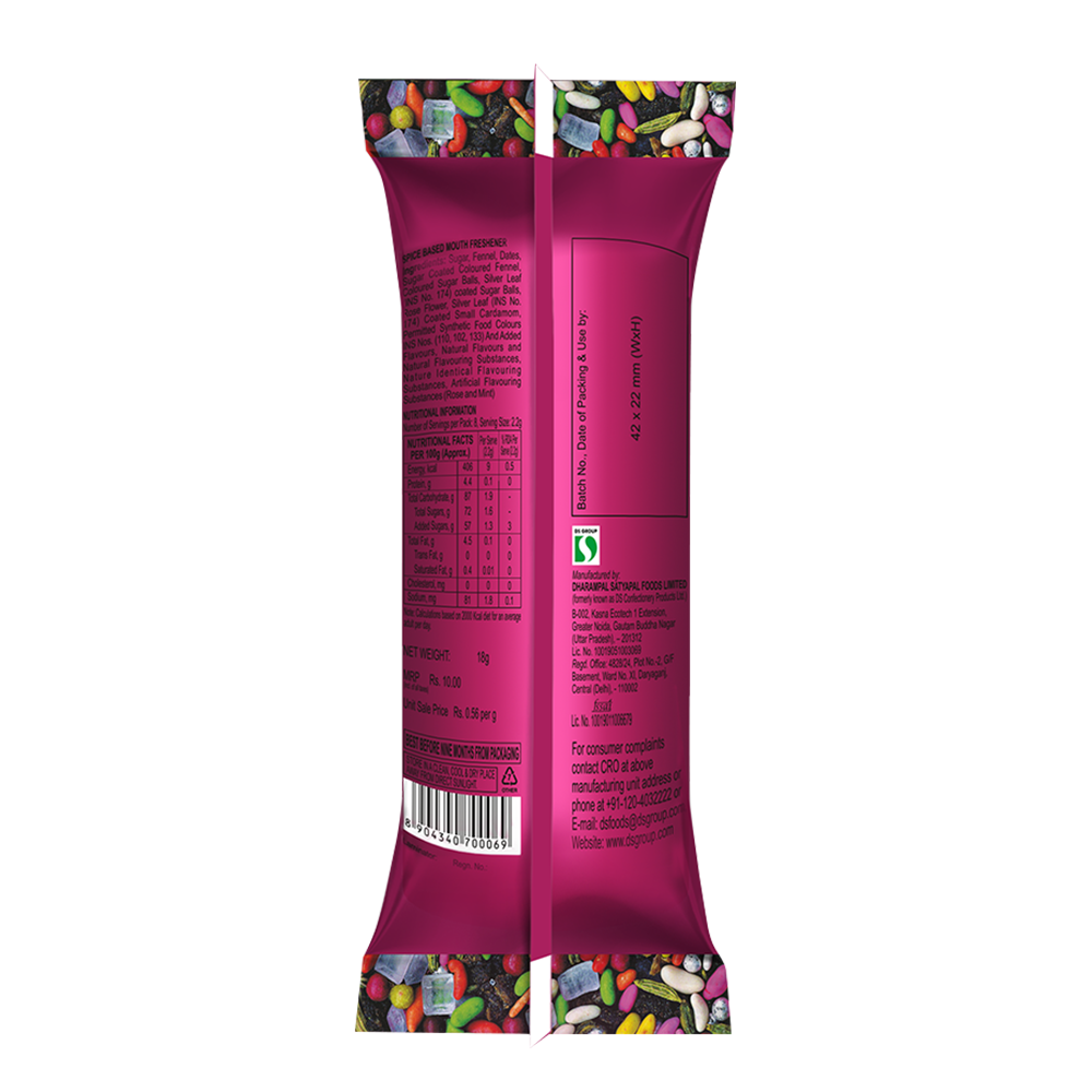 Sugar, Fennel, Dates, Sugar Coated Coloured Fennel, Coloured Sugar Balls, Silver Leaf (INS No. 174) coated Sugar Balls, Rose Flower, Silver Leaf (INS No. 174) Coated Small Cardamom, Permitted Synthetic Food Colours INS Nos. (110, 102, 133) and Added Flavours, Natural Flavours and Natural Flavouring Substances, Nature Identical Flavouring Substances, Artificial Flavouring Substances (Rose and Mint)