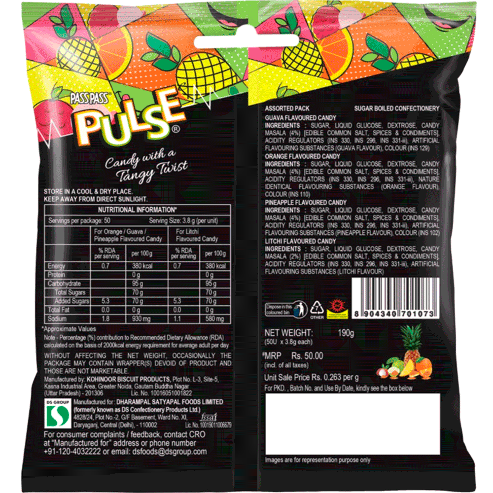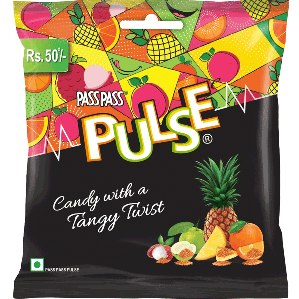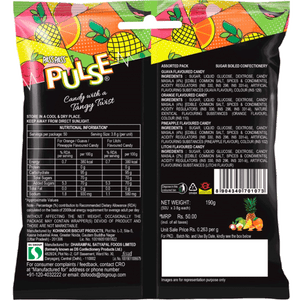 Dive into a whirlwind of tangy twist with Pulse Pouch Assorted Candy Pack. This pack is a vibrant mix of your favorite Pulse candy flavors: Litchi, Guava, Orange & Pineapple. Each piece is a explosion of flavor, perfectly balanced with a tangy twist that will leave you wanting more. With 50 pieces in a zip lock pouch, it's the perfect treat for sharing with friends and family, or for keeping all for yourself!