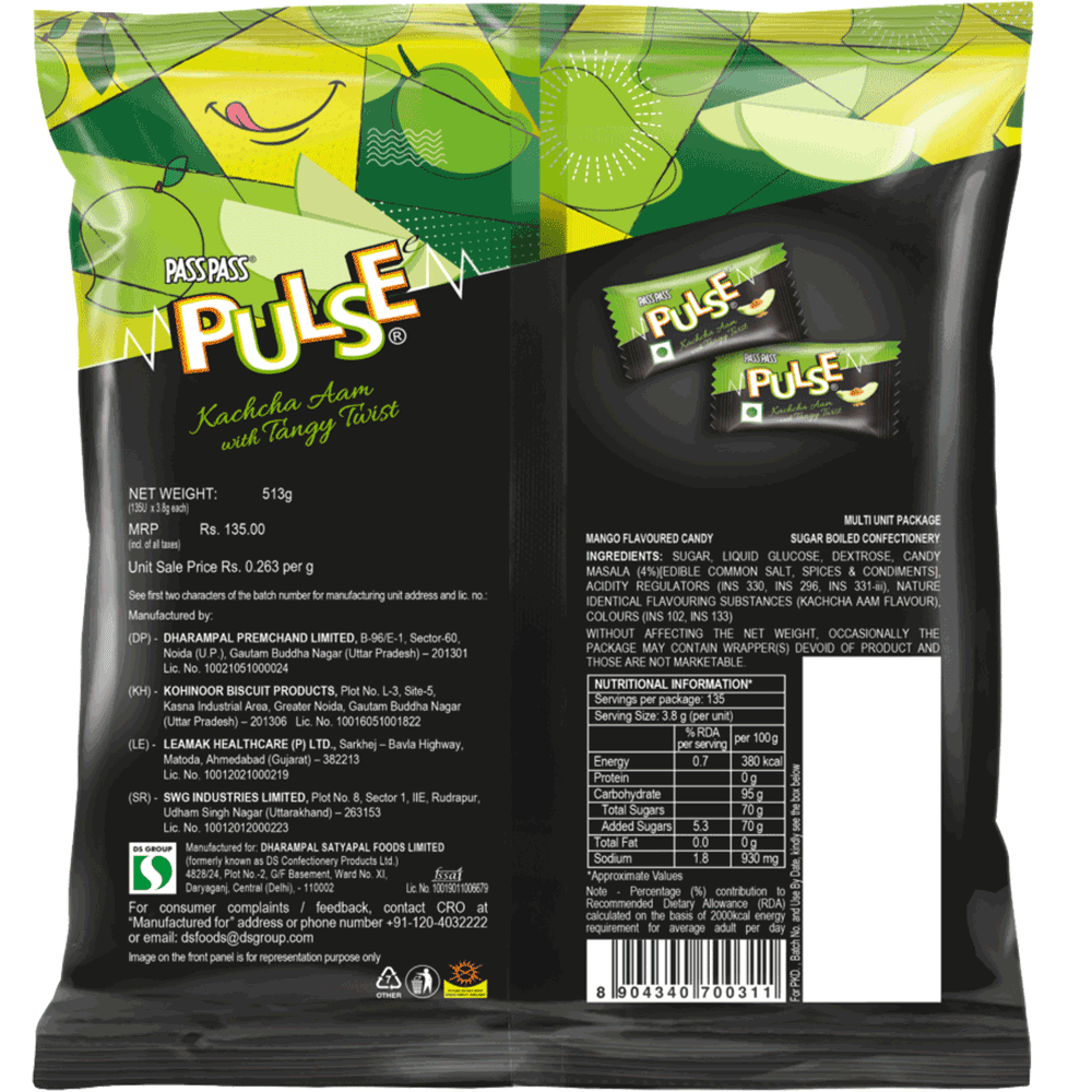 To satiate your Kachcha Aam (raw mango) cravings, we’ve got you covered with our hard boiled candy - Pulse Kachcha Aam. This candy brings alive the taste of raw mango filled with a secret masala. The masaledaar twist to Kachcha Aam makes it irresistibly tangy and flavourful. Grab your pack now and we assure you that this tangy toffee will never be enough for you. Pass Pass Pulse, the candy from DS Group was launched in 2015. Pulse is available in different flavours - Kachcha Aam, Guava, Orange, Pineapple & Litchi. Each flavor has the burst of tanginess, a mouth full of fun and peculiarity that is alluring. This irresistible fervour for Pulse candy is extended to the brand communication, with a tag line of ‘Pran Jaaye Par Pulse Na Jaaye’. The unique and innovative combination of tastes has made Pulse stand out and become a nationwide favourite.